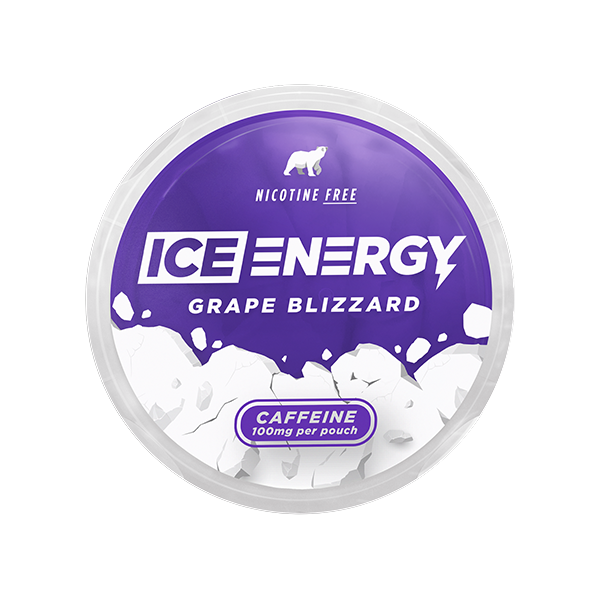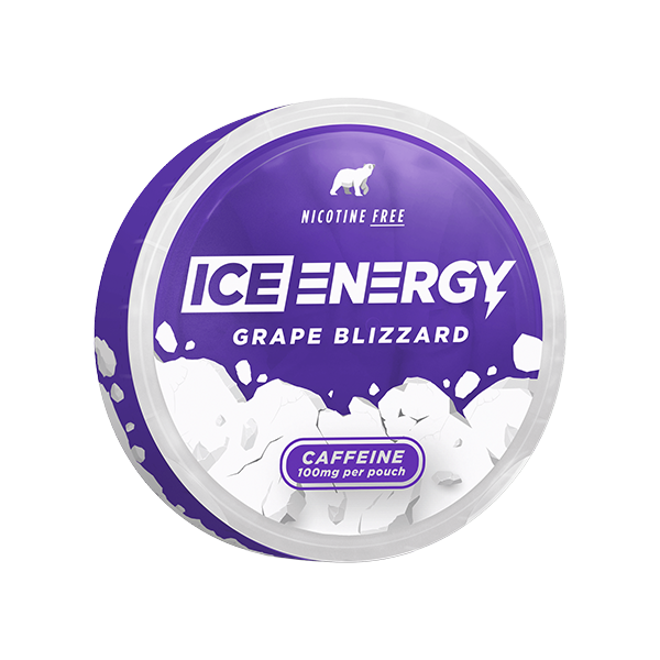 ICE Caffeine Pouch Grape Blizzard 100mg combines grape and mint flavor in a slim pouch format. Each pouch contains 100mg of caffeine for a strong energy boost. The product is 100% tobacco- and nicotine-free, with 20 pouches included per can.